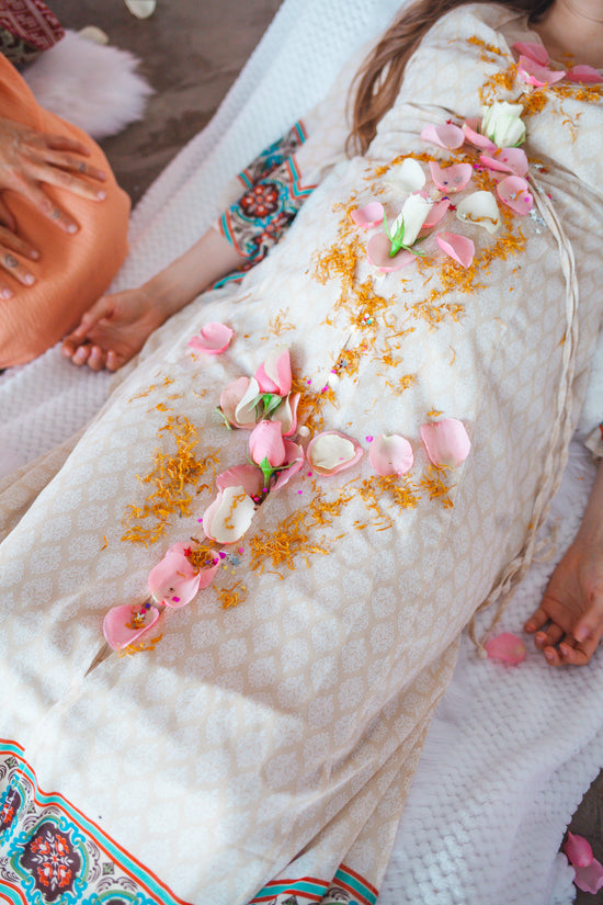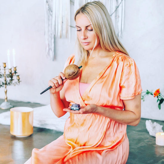 Vi lägger en blomster/ört mandala på din mage där vi i varje blad väver in en blessing, välkomnande och det som vill komma intuitivt. Det är en stund att verkligen medvetet för dig välkomna in det lilla livet. Vi aktiverar kristaller som kommer att läggas i ett knyte tillsammans med en del av de blommor som du haft på magen. Detta knyte får du med dig och kan läggas nära bebisen och under småbarnsåren för trygg energi och grundning. Du får också ta emot en Soundhealing för magen och så delar vi ett meddelande från din bebis som vi intuitivt får till oss.